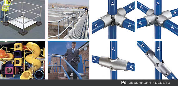 Los conectores están fabricados en hierro fundido galvanizado y cumplen todos los requerimientos BS EN 1562. Una gama muy amplia de conectares en 8 tamaños diferentes está disponible. Una llave hexagonal es la única herramienta requerida para crear una estructura fuerte y sólida. Un tornillo prisionero presiono fuertemente el conector al tubo. El tornillo está fabricado en acero endurecido y lleva una protección especial contra lo corrosión.